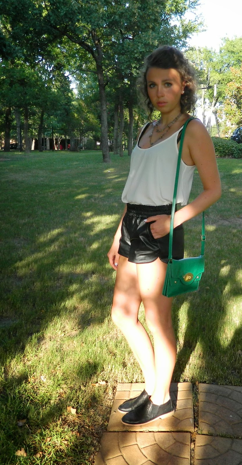 My friends and I decided to go on a spontaneous trip into Dallas tonight for dinner, Sprinkles cupcakes, and Klyde Warren Park. I paired my "leather" shorts with a basic white camisole over my go-to black lace bralette. Then, I did my favorite thing, and raided my mother's closet for shoes and accessories. I topped everything off with a pop of color, my green purse.